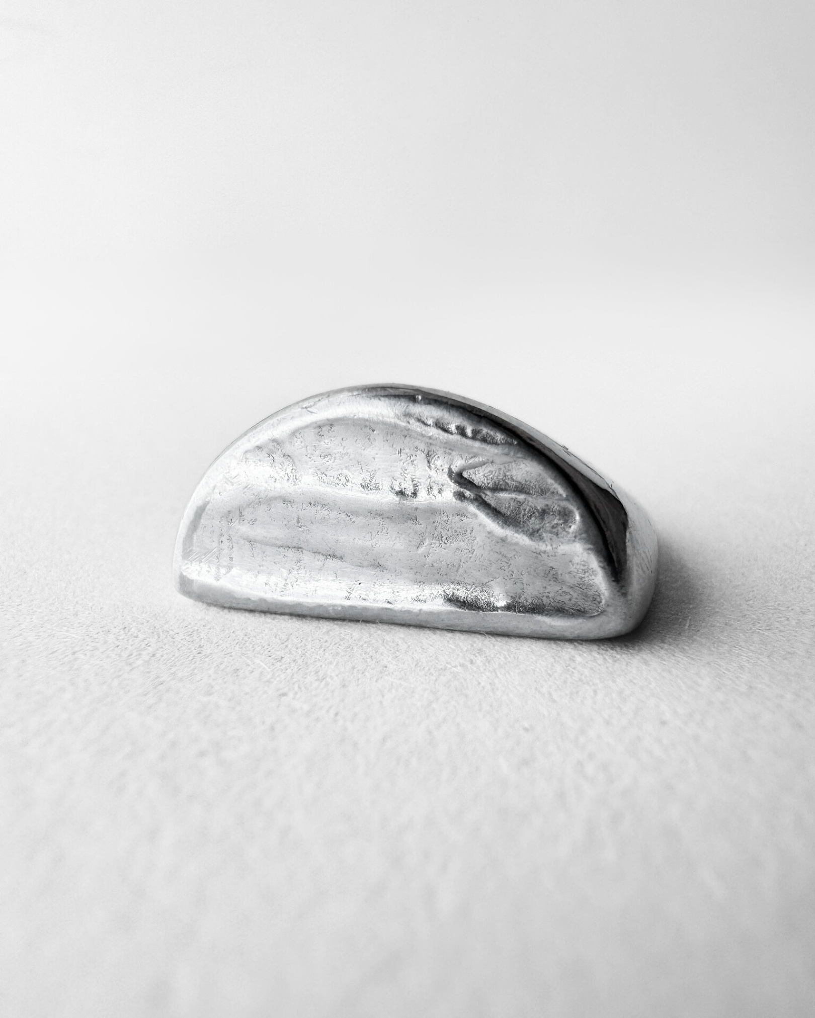 Un mezzo cerchio che richiama il profilo curvo della baia di Chiaia di Luna a Ponza, con una superficie leggermente irregolare ispirata alla texture della parete rocciosa e delle pietre levigate dal mare. Il design evoca la morbidezza della spiaggia, il tramonto che si riflette sull’acqua e la sensazione tattile delle rocce. Indossato da solo o abbinato al suo gemello in finitura diversa, crea un gioco di contrasti: come il sole e il suo riflesso.