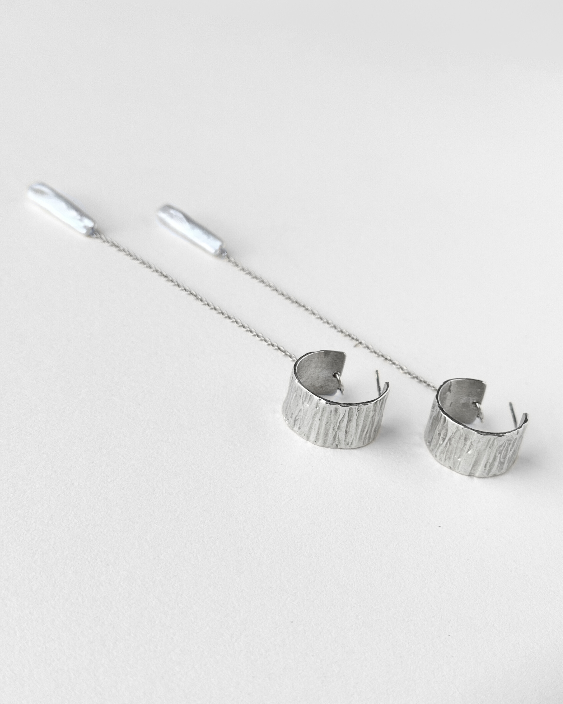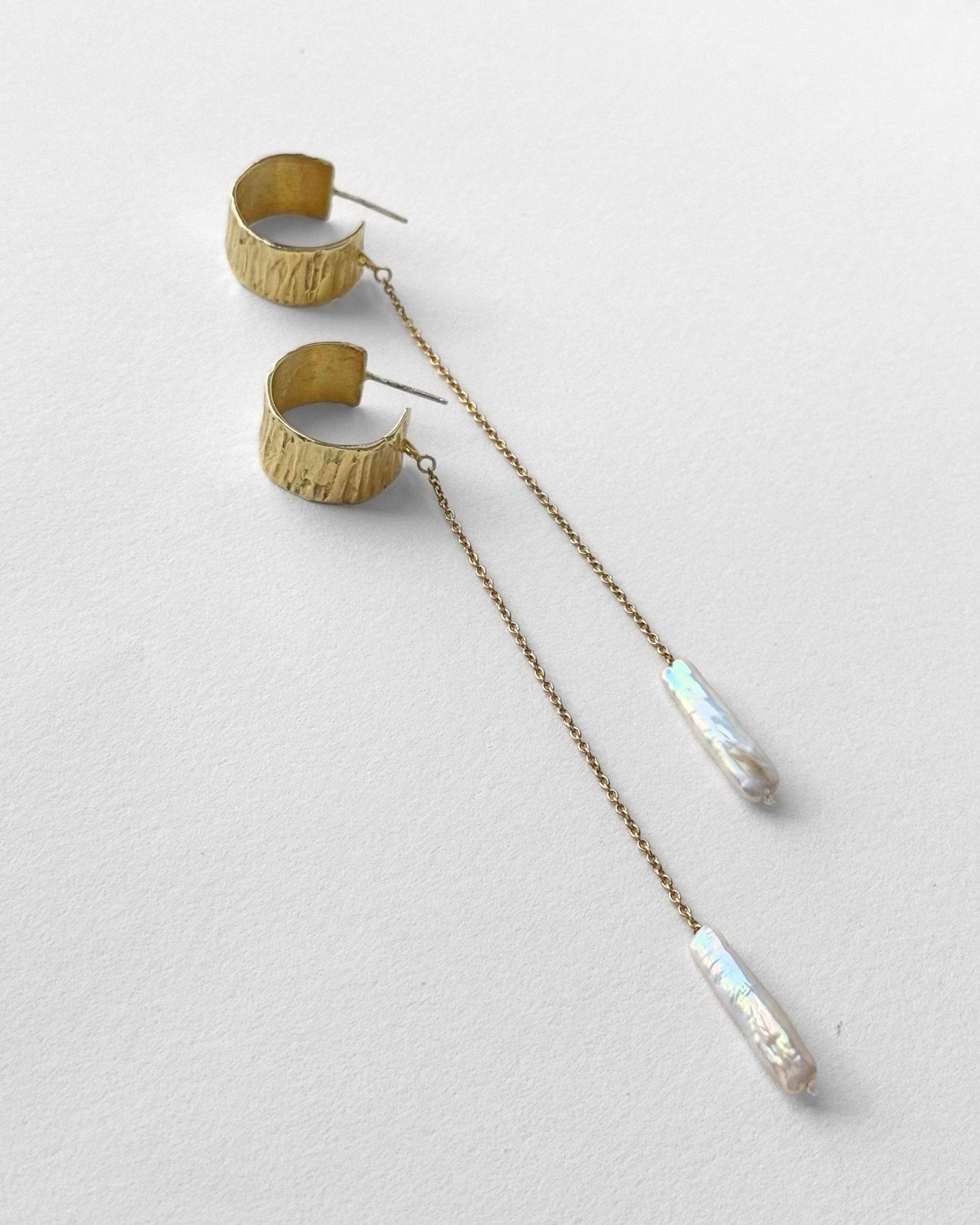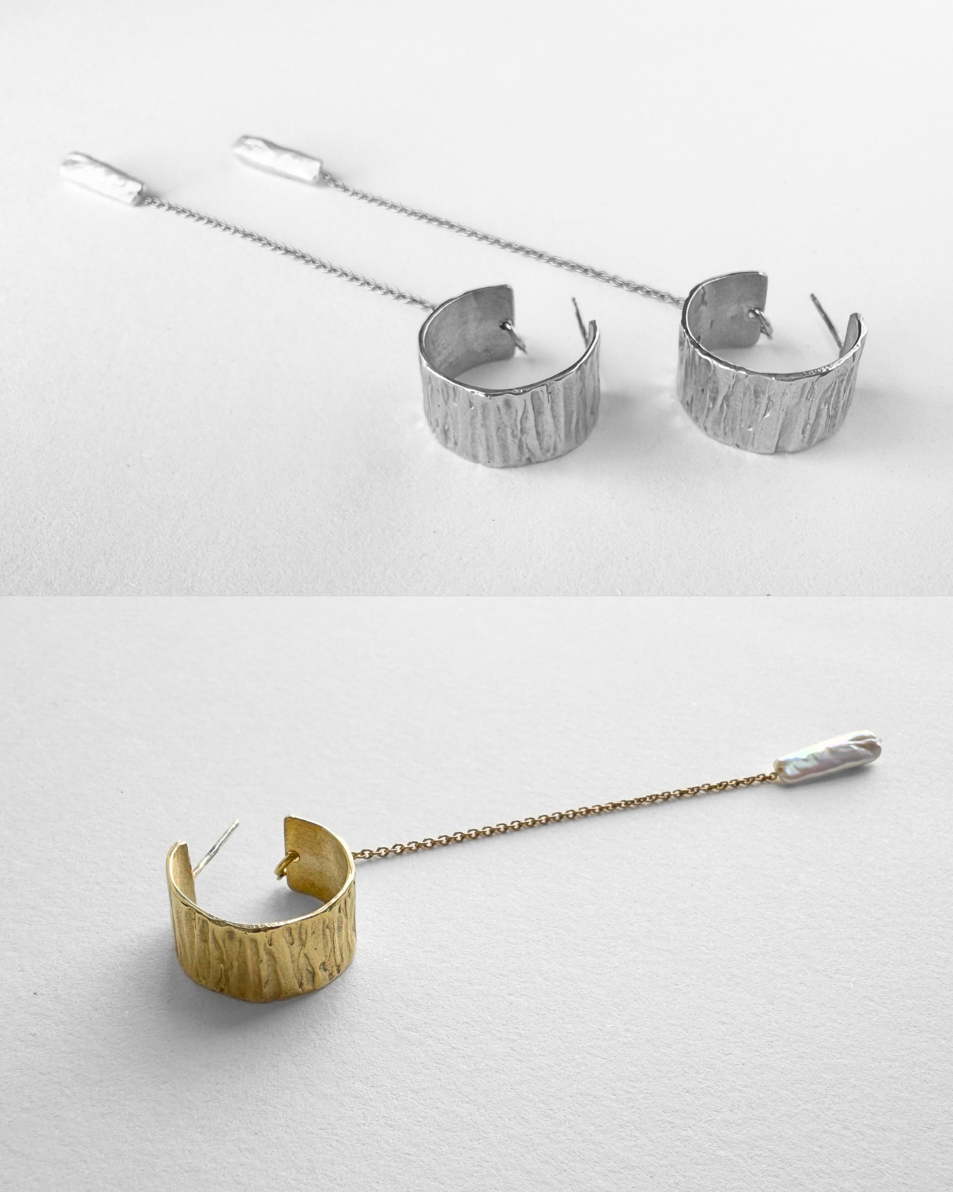Due cerchi con la texture incisa dell’acqua increspata, ispirata al movimento della superficie marina. Dal retro, una catenina sottile — removibile — scende leggera e termina in una madreperla barocca, irregolare e luminosa come un frammento raccolto sul fondo del mare. Da indossare con o senza pendente, per cambiare stile con un solo gesto.