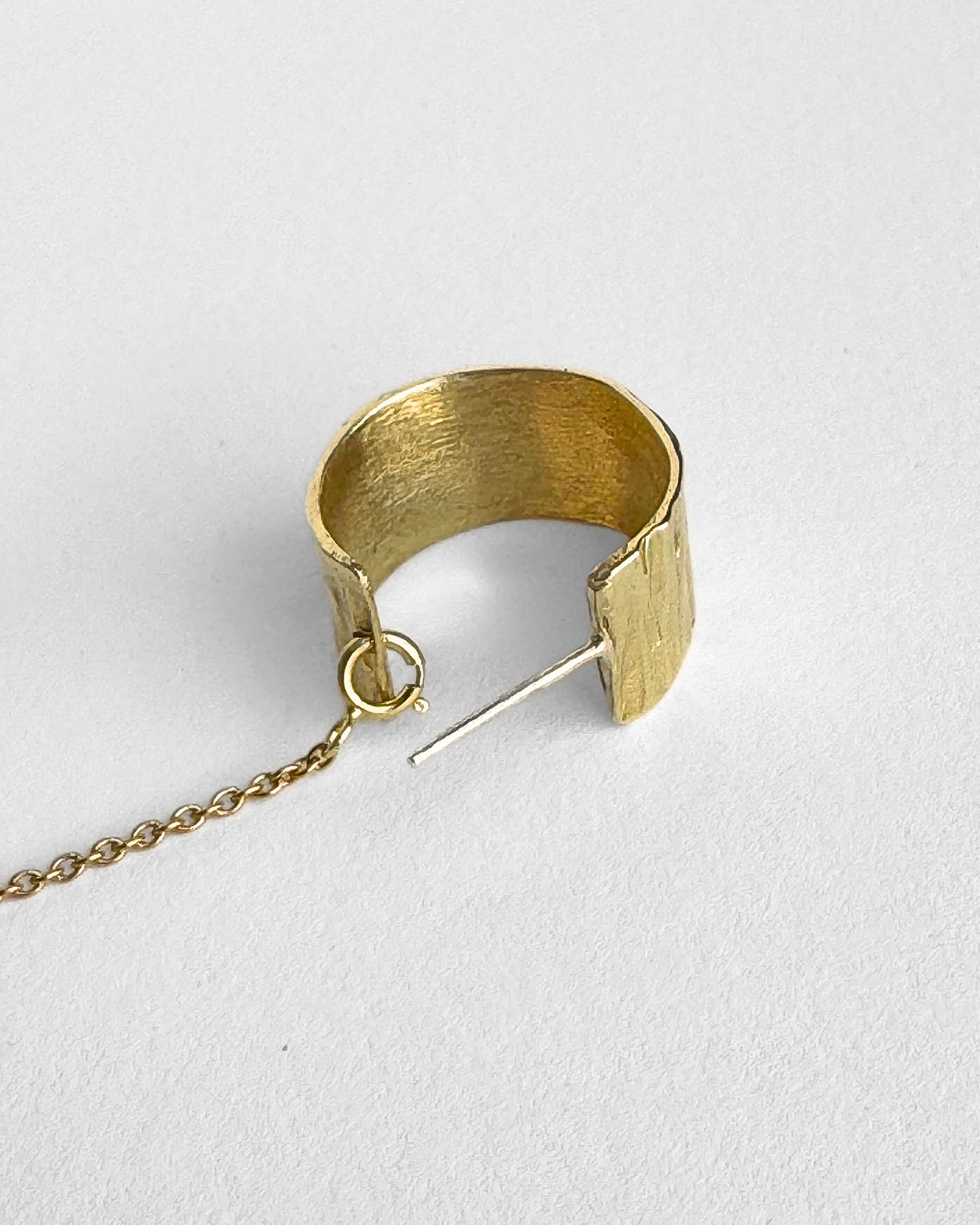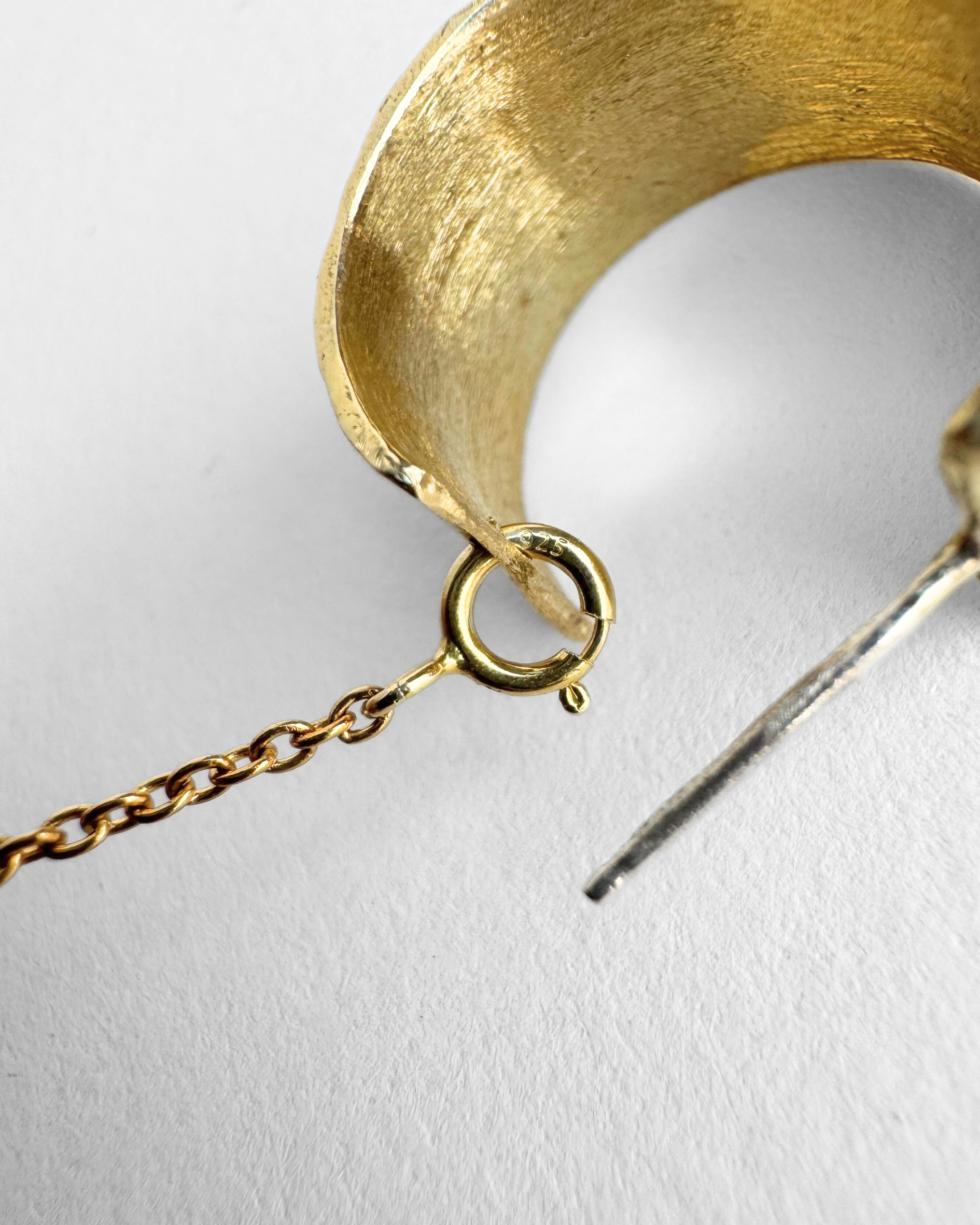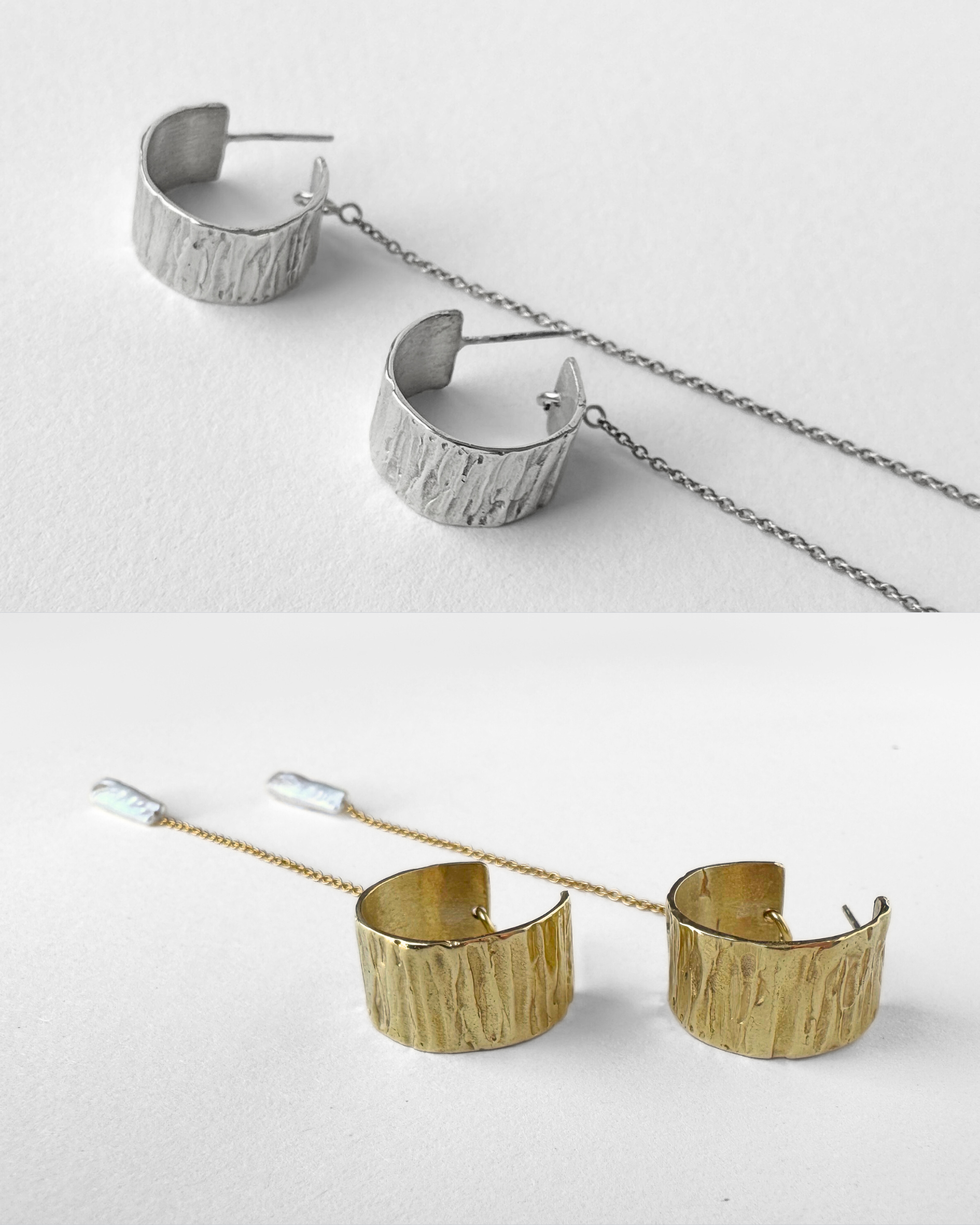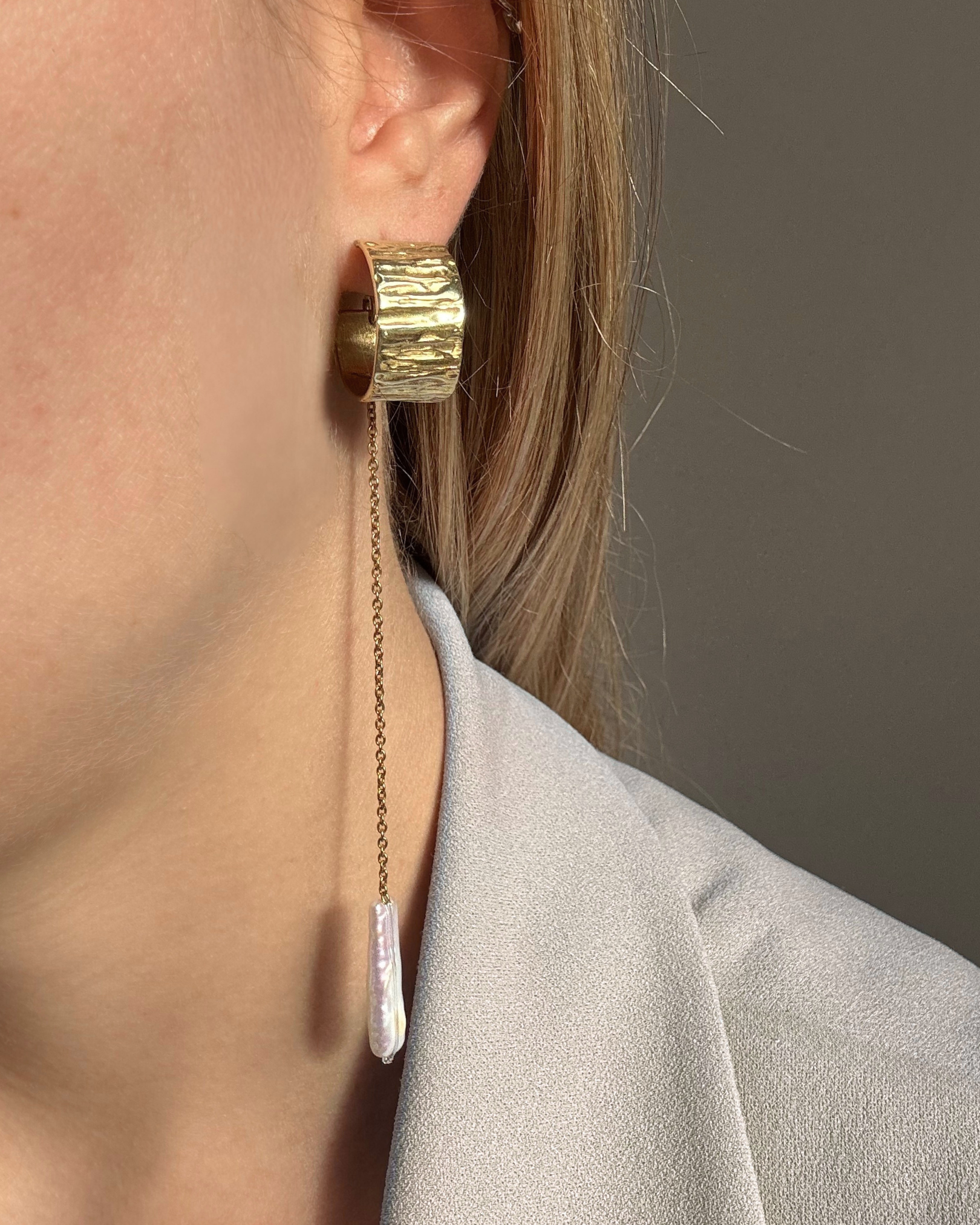 Due cerchi con la texture incisa dell’acqua increspata, ispirata al movimento della superficie marina. Dal retro, una catenina sottile — removibile — scende leggera e termina in una madreperla barocca, irregolare e luminosa come un frammento raccolto sul fondo del mare. Da indossare con o senza pendente, per cambiare stile con un solo gesto.