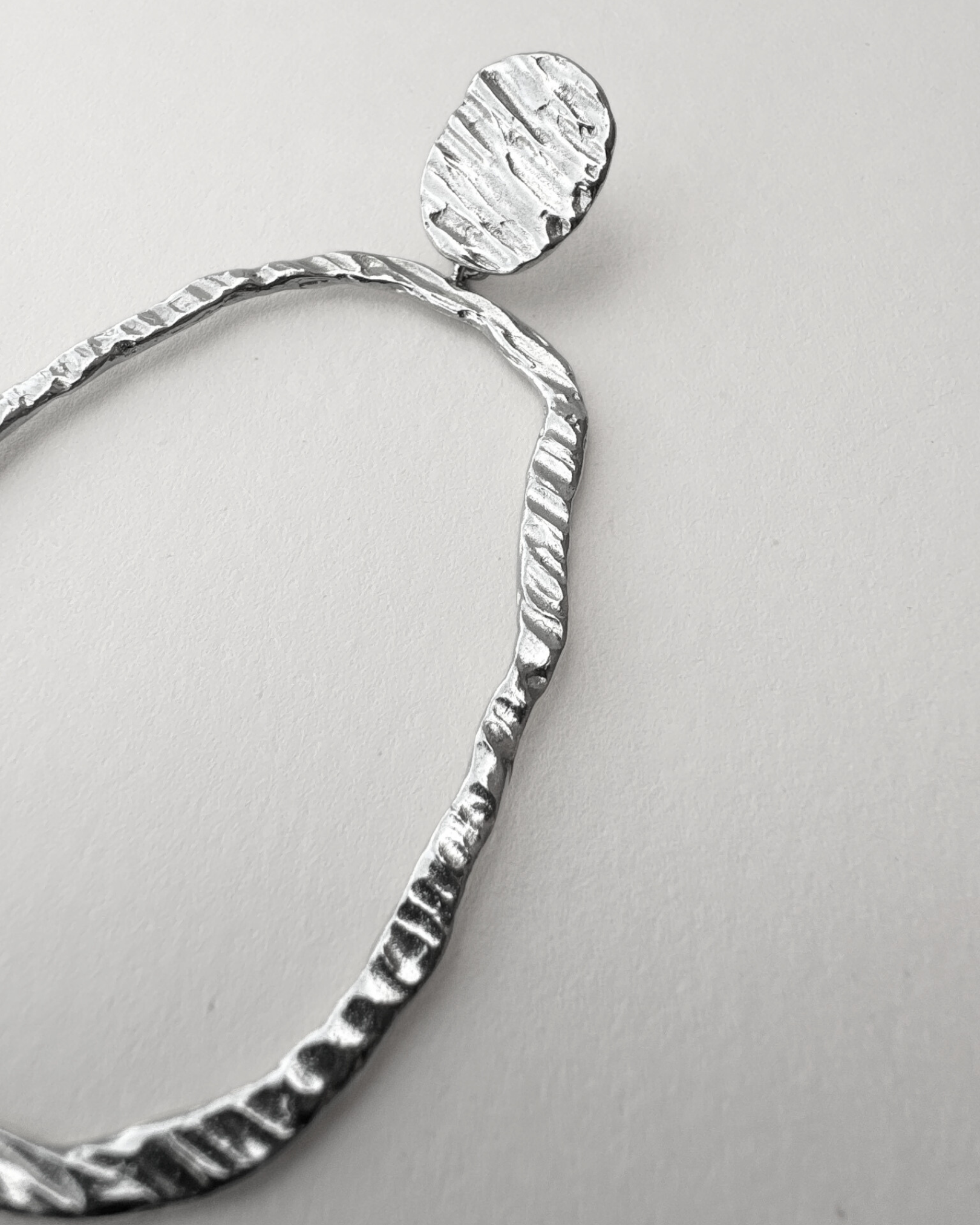 Un perno tondo e un cerchio sospeso, entrambi con il disegno dell’acqua increspata. Il cerchio si muove liberamente, mettendo in evidenza i giochi di luce che ricordano quelli che si formano sulla superficie del mare.