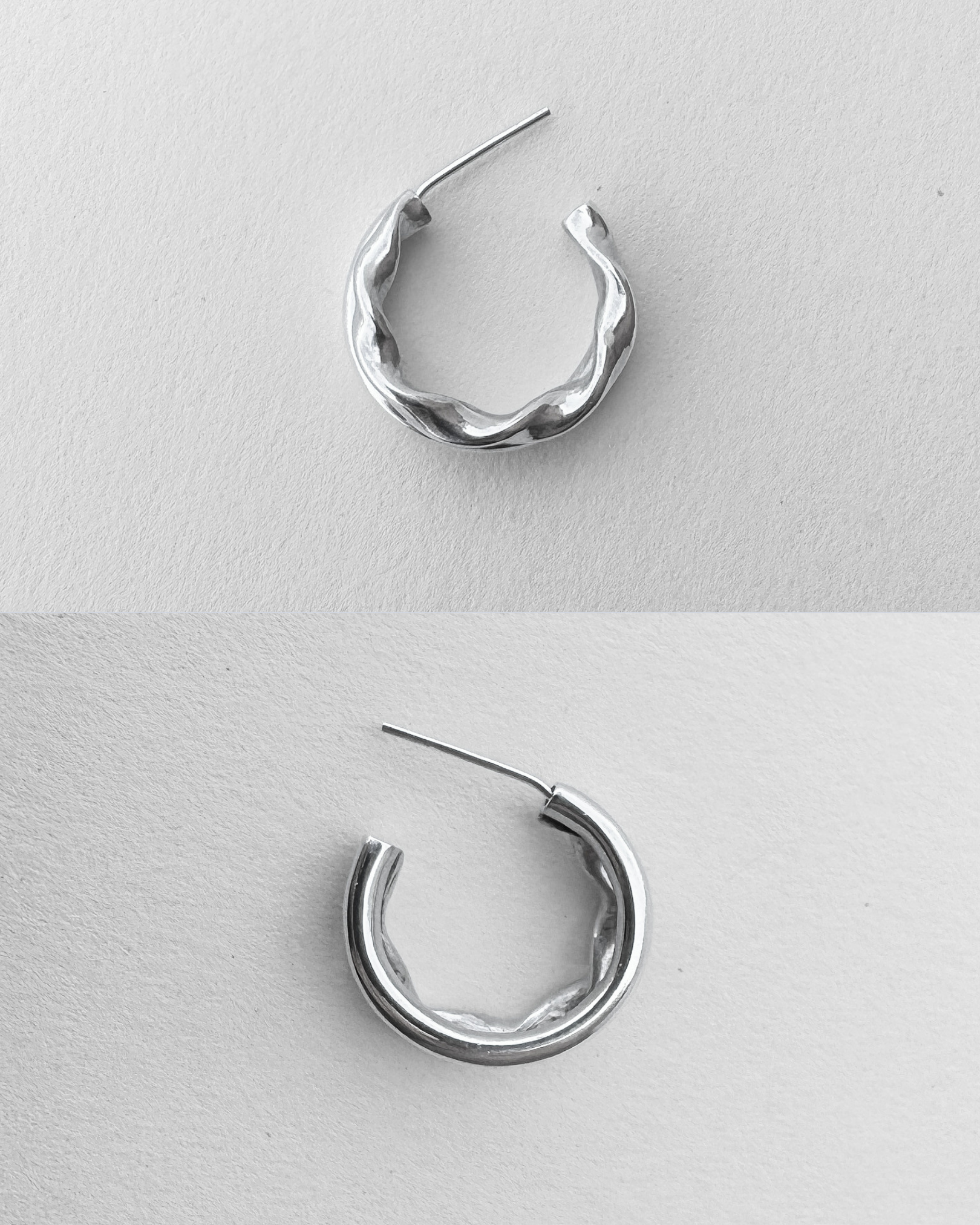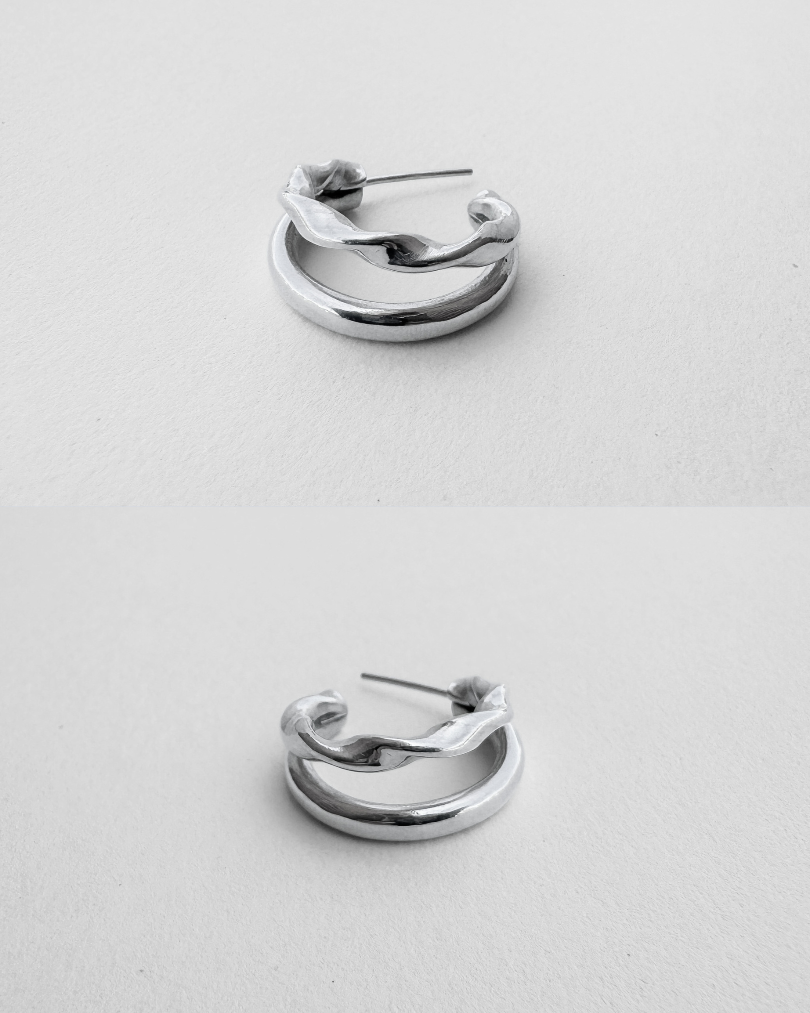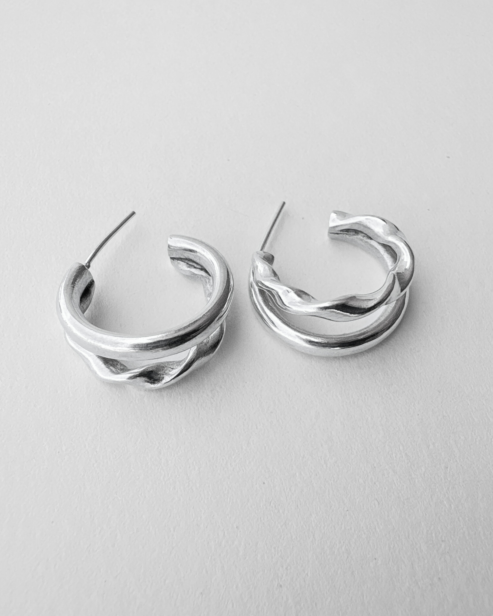 Orecchini composti da due cerchi quasi paralleli: uno liscio e l’altro con una forma elicoidale che crea un movimento leggero e sofisticato.